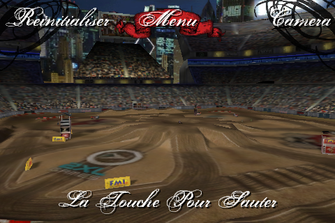 Tout le reste se fait à l’accéléromètre, on penche à gauche pour tourner à gauche, à droite pour tourner à droite et en avant ou en arrière pour régler l’assiette durant un saut. Il y a plusieurs caméras possibles, dont une sur le casque plutôt réaliste! Captures d’écran et vidéo dans la suite du billet :Vidéo « in-game« , comme vous pouvez le constater, le bruit des 2-Temps participe beaucoup au réalisme du jeu :