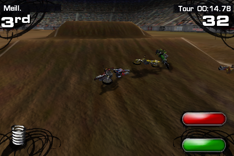 2XL SuperCross est un jeu de motocross pour iPhone (et iPod Touch) disponible sur l’AppStore au prix de 5.99€. Le jeu débute par une superbe cinématique sans même un temps de chargement. Toujours sans attendre, on peut immédiatement débuter une course après avoir choisi son pilote, sa monture et le circuit. L’interface est bien pensée, très intuitive et réactive. Le jeu est très réaliste. Le gameplay est simple et efficace : un bouton pour accélérer, l’autre pour freiner. |